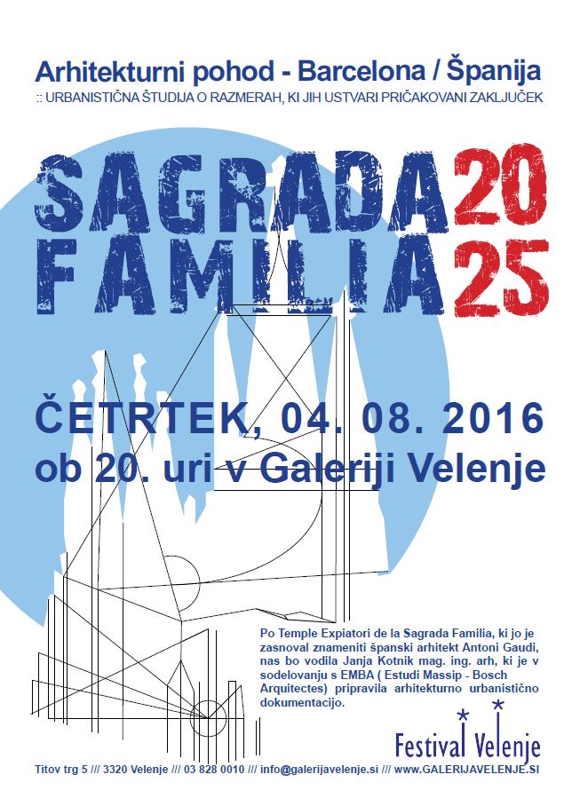 Vabljeni na arhitekturno predavanje o znameniti barcelonski katerdrali Sagradi familii, ki jo je zasnoval španski arhitekt Anotni Gaudi. Skozi njo nas bo popeljala mag. ing. arh. Janja Kotnik, ki je v sodelovanju z EMBA (Estudi Massip - Bosch Arquitectes) pripravila arhitekturno urbanistično dokumentacijo. Predavanje bo v četrtek, 4. 8. 2016, ob 20. uri v Galeriji Velenje.