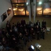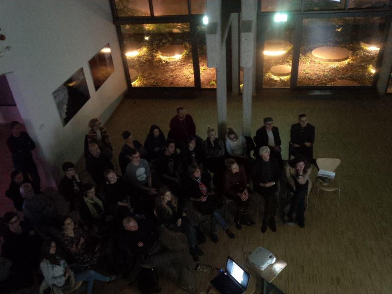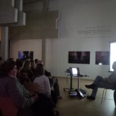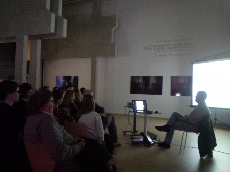 Ob predavanju si boste lahko ogledali razstavo video umetnice Nataše Prosenc Stearns, ki se predstavlja s serijo printov in z video instalacijama Hotelski dnevnik in Zlata zavesa.
